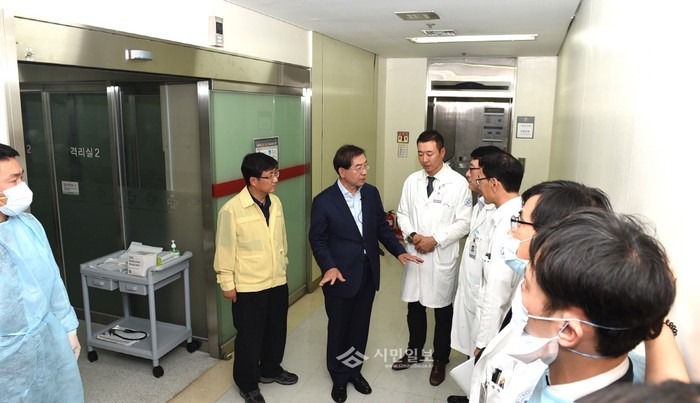 노원구는 지난 16일 오후 2시 메르스 환자진료 국민안심병원을 격려하기 위해 인제대학교 상계백병원을 방문한 박원순 서울시장과 함께 현장방문을 실시했다. 김성환 노원구청장(왼쪽)과 상계백병원 의료진들이 박 시장과 함께 병원 라운딩을 하며 이야기를 듣고 있다. (사진제공=노원구청)
