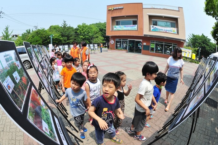 인천 부평구 청천1동 주민자치위원회가 최근 청천1동 지역 환경개선을 위해 뫼골공원에서 '2015 지역활성화사업 사진 전시회'를 개최한 가운데 어린이들이 전시회장을 찾아 사진을 감상하고 있다.(사진제공=부평구청)