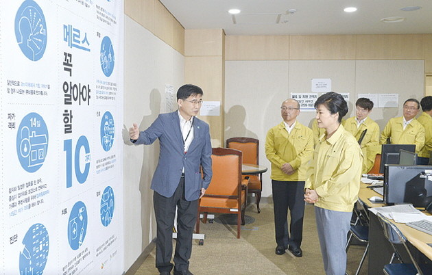 박근혜 대통령이 17일 오후 세종시 정부세종청사 보건복지부에 위치한 중앙메르스관리대책본부 즉각대응팀을 찾아 김우주 팀장으로부터 메르스(MERS·중동호흡기증후군) 대응 활동상황에 대해 보고받고 있다.