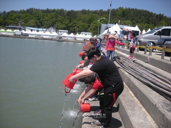전남 장흥군이 최근 기후변화와 바다오염 등으로 감소되고 있는 수산자원 증강을 위해 해양낚시공원에 감성돔 23만미를 방류하는 행사를 진행했다. 사진은 감성돔을 방류 중인 방문객들의 모습.(사진제공=장흥군청)
