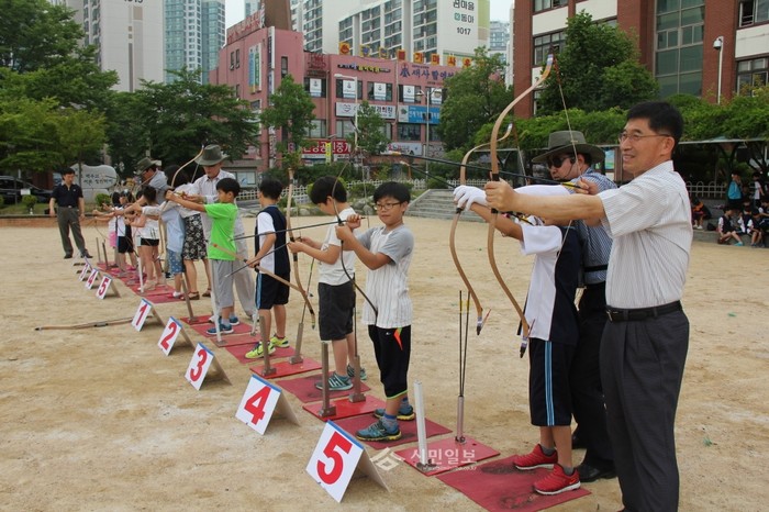 경기 부천시 심원초등학교가 최근 3학년 학생들을 대상으로 궁도강습회를 진행했다. 사진은 강습에 참여한 학생들이 궁도 전문 지도교사의 교육에 따라 활시위를 당기고 있는 모습.(사진제공=부천교육지원청)