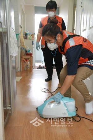 구로소방서 의용소방대원들이 지난 17일 오전 금천구 시흥동 일대 홀몸중증장애인 가정을 방문해 위생소독 및 감염방지 청소 등 메르스 감염예방활동을 실시하고 있다.(사진제공=구로소방서)