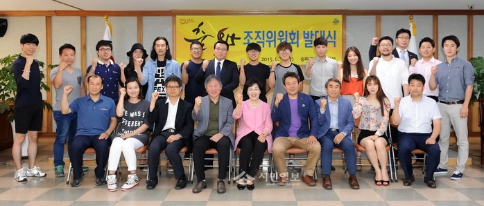 지난 16일 서울 송파구청 대회의실에서 광복 70주년 맞이 '춤 815' 조직위원회 발대식이 열렸다. 사진은 박춘희 구청장(앞줄 가운데)과 자문위원 및 조직위원들이 기념촬영을 하고있는 모습.(사진제공= 송파구청)