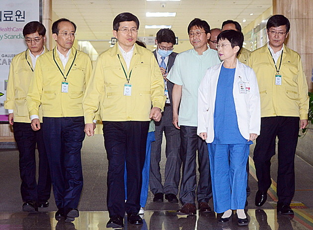 황교안 신임 국무총리가 18일 오후 서울 을지로 국립중앙의료원을 방문해 안명옥 국립중앙의료원장 등과 함께 메르스 치료 상황을 보고 받으며 이동하고 있다.