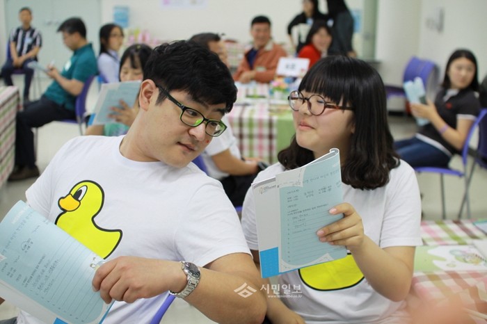 전남 목포 혜인여자중학교는 최근 전남여성플라자에서 '제2회 아빠랑 딸이랑 함께하는 캠프를 진행했다. 사진은 캠프에 참여한 부녀가 서로 다정하게 이야기 하고 있는 모습.