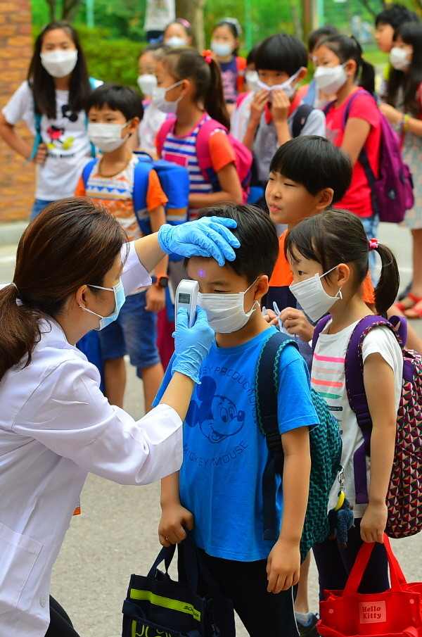 메르스(MERS·중동호흡기증후군) 여파로 휴업한 경기 화성 동탄신도시의 한 초등학교의 등교가 최근 재개돼 학생들이 교실 앞에서 체온을 재고 있다.