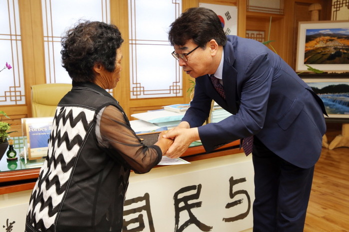 전남 장흥군희망복지지원단은 최근 가족을 부양하며 힘들게 생활하고 있는 지역내 여성가장세대 3가구에게 1200만원의 지원금을 전달했다. 사진은 김성 장흥군수가 지원금을 전달하는 모습. (사진제공=장흥군청)