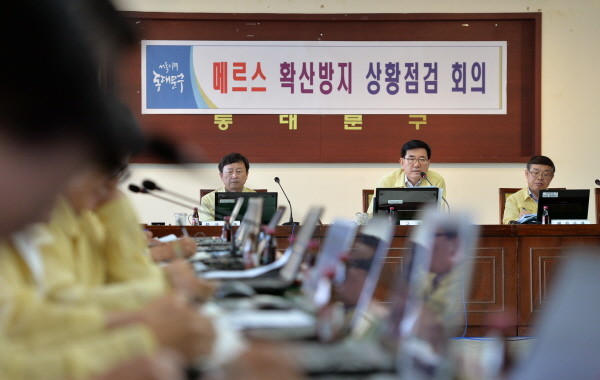 유덕열 동대문구청장(가운데)이 최근 구청 기획상황실에서 열린 '메르스 확산 방지를 위한 동대문구 긴급확대간부회의'에 참석해 회의를 주재하고 있다. (사진제공=동대문구청)