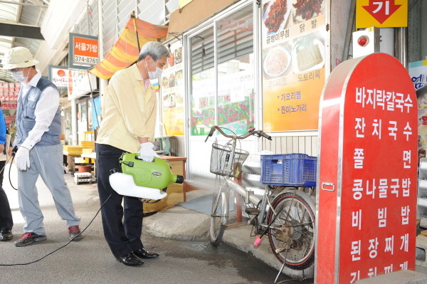곽상욱 경기 오산시장이 지난 19일 오산오색시장을 방문해 중동호흡기질환(메르스) 예방을 위해 직접 방역활동에 나섰다. 사진은 곽상욱 시장(오른쪽)이 직접 소독기를 들고 시장 내부에 방역을 실시하고 있는 모습.(사진제공=오산시청)