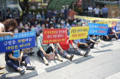 소식통에 따르면 지난 18일 금광1구역 일부 주민들은 LH 성남재생직할사업단 앞에서 시위를 벌였다. 이들은 “설계 평면, 금리, 분양금액 등 모든 조건을 면밀히 검토해 봤을 때 불만의 목소리가 나올 수밖에 없다.”며, “심지여 금광1구역에서 수익을 신흥2구역에 투자하는 것 아니냐는 비난의 목소리가 높아지고 있다. 한국토지주택공사(LH)가 시행사인 만큼 금광1구역 사업에도 신경을 써라”고 성토했다.