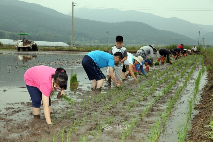 전남 장흥군진보연대는 최근 관산읍 남송리에서 통일쌀 경작지 모내기 행사를 개최했다. 사진은 이날 행사 참여자들이 직접 손모내기를 하고 있는 모습. (사진제공=장흥군청)