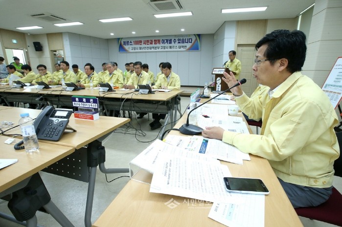 경기 고양시가 23일 덕양구보건소에 설치된 고양시 재난안전 대책본부에서 시 간부공무원이 참석한 가운데 메르스 대응 종합 대책보고회를 가졌다. 사진은 최성 고양시장(오른쪽)이 회의에서 발언 중인 모습. (사진제공=고양시청)