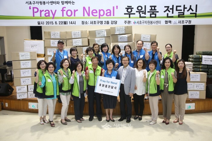 지난 22일 서울 서초구청 2층강당에서 지역내 자원봉사캠프, 전문봉사단, 자원봉사자들이 모은 1686점의 후원품을 네팔 대지진 이재민들에게 후원하는 ‘Pray for Nepal’ 후원품 전달식에 참가한 봉사자들이 기증품과 함께 파이팅을 외치며 기념촬영을 하고 있다. (사진제공=서초구청)