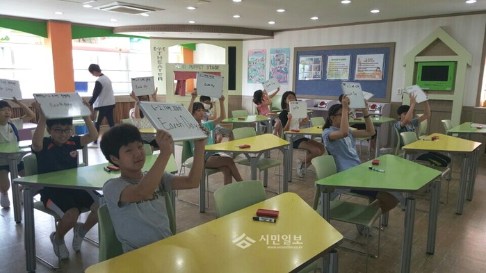 경기 부천중원초등학교가 최근 학교 특색 사업인 'AMUSE 영어 독서 교육 프로그램'의 일환으로 영어 골든벨 대회를 실시했다. 사진은 영어골든벨에 참여한 학생들이 칠판에 답을 적어 들고 있는 모습.