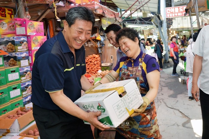 동대문구 구청 직원들이 지난 23일 메르스 사태로 매출이 감소한 지역내 전통시장을 방문해 물품 구입을 진행했다. 사진은 이날 경동시장을 방문한 한 직원이 상인에게 감자를 구입하고 있는 모습.(사진제공=동대문구청)