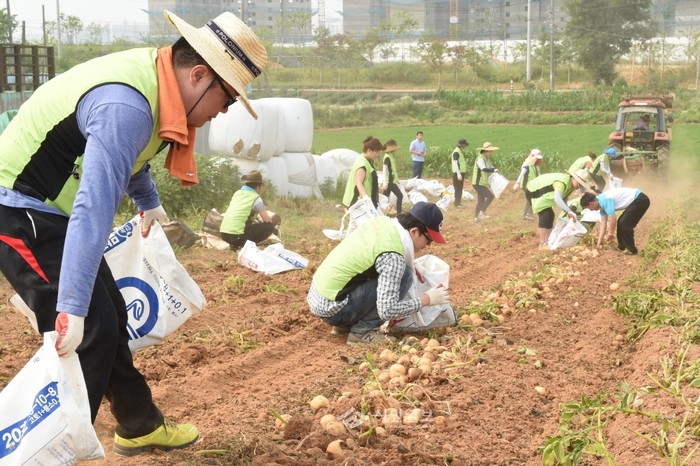 경기 수원시 공무원들로 구성된 봉사단은 24일 메르스 여파로 일손이 모자라는 평택 농가를 찾아 농촌일손 돕기에 나섰다. 사진은 이날 참여 봉사자들이 일손 돕기의 일환으로 감자를 캐고 있는 모습. (사진제공=수원시청)