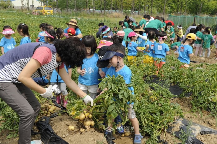 최근 경기 안산시 단원구가 구청 뒤편 유휴지에서 실시한 ‘단원뜰 생태농원 감자캐기 체험학습장’에 참가한 아이들이 즐겁게 감자를 수확하고 있다.(사진제공=단원구청)