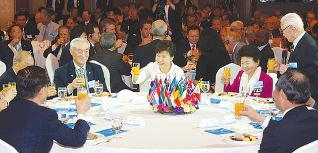 박근혜 대통령이 24일 오후 서울 소공동 롯데호텔에서 열린 6.25전쟁 제65주년 국군 및 UN군 참전유공자 위로연에 참석해 내빈들과 건배를 하고 있다.