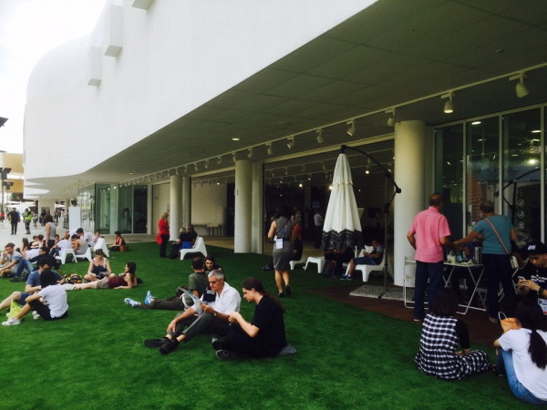 지난 23일 오전(현지 시각) 밀라노 엑스포가 열리고 있는 이탈리아 밀라노 엑스포장 한국관 행사장을 찾은 방문객들이 행사장 앞에 앉아 담소를 나누고 있다.