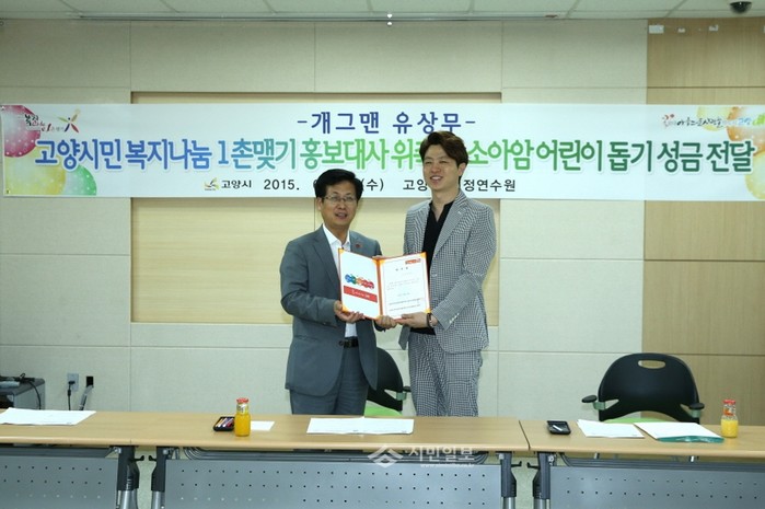 지난 24일 개그맨 유상무씨가 경기 고양시 시정연수원에서 국립암센터에 전달할 성금 3000만원을 기부했다. 이날 유씨는 '고양시민 복지나눔 1촌맺기' 홍보대사로 위촉됐다. 사진은 전달식에서 최성(왼쪽) 시장과 유씨가 함께 기념촬영한 모습. (사진제공=고양시청)