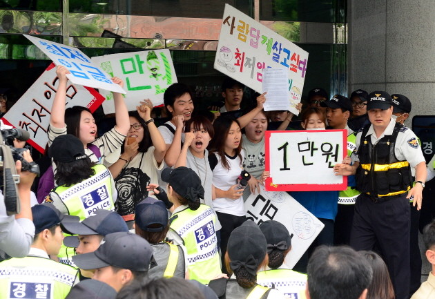25일 오전 서울 마포구 경총회관 앞에서 2016년도 최저임금 동결안을 제시한 경총을 규탄하며 기습시위를 벌인 아르바이트생들을 경찰이 연행하고 있다.