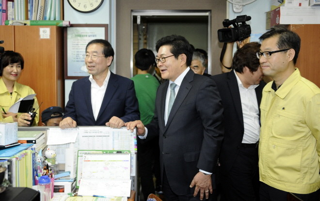 박원순 서울시장이 최근 광진구 보건소 3층 메르스 대책본부를 방문해 메르스 대응 상황을 점검했다. 사진은 박 시장(왼쪽)과 김기동 광진구청장(가운데)이 현장 직원들을 격려하고 있는 모습.(사진제공=광진구청)