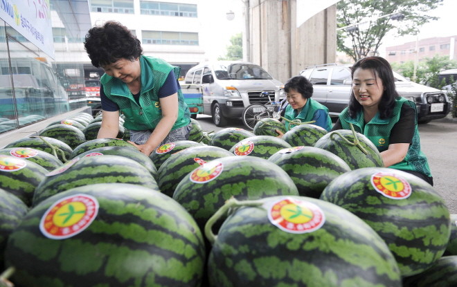 최근 무더운 여름철을 맞아 '사랑의 수박 드리기 행사'를 개최한 송파구 새마을부녀회가 지역내 저소득 노인들에게 전달할 수박 250통을 차곡차곡 쌓고 있다.(사진제공=송파구청)