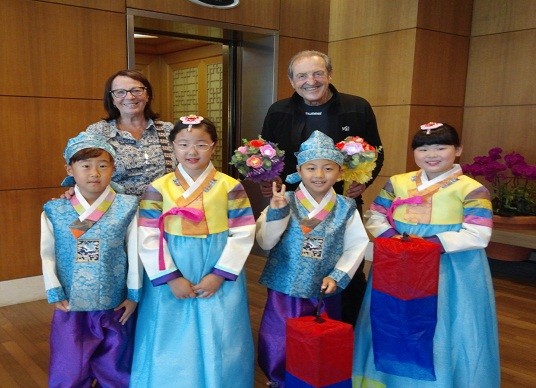 | ▲ 광주U대회 주최 기관인 국제대학스포츠연맹(FISU)의 끌로드 루이 갈리앙 회장이 27일 인천공항에 입국해 광주 U대회조직위가 마련한 영접을 받고 화동들과 함께 기념사진을 담은 모습. | ||