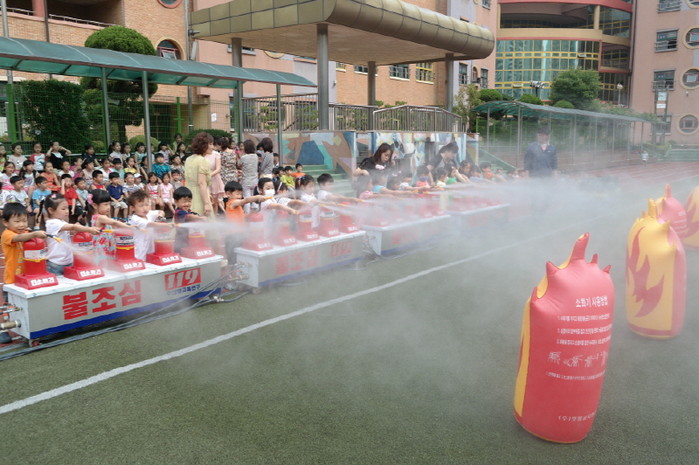 경기 부천시 상원초등학교가 최근 전교생을 대상으로 학교 운동장에서 '체험형 재난안전 교육'을 실시했다. 사진은 이날 교육에 참여한 학생들이 소화기를 통해 가상 화재진압 체험을 하고 있는 모습.(사진제공=부천교육지원청)