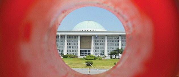 국회법 개정안 거부권 사태로 정국이 얼어붙은 가운데 28일 오전 서울 여의도 국회가 바리케이트 사이로 보이고 있다.