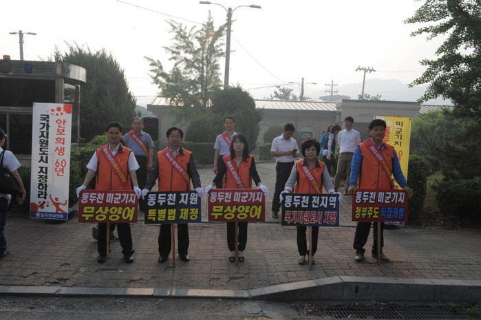 경기 동두천시의회가 오는 7월16일까지 시의 요구가 관철돼 정부의 지원 방안이 확정될 때까지 모든 수단을 동원해 대정부 투쟁에 나선다. 사진은 미2사단 캠프케이시 정문 앞에서 미군잔류를 규탄하는 대정부 시위를 하고 있는 의원들의 모습.(사진제공=동두청시의회)