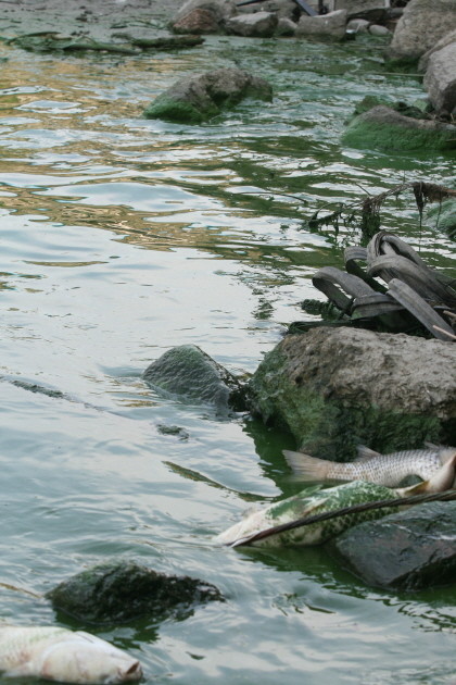 29일 오전 경기 고양시 행주대교 북단 행주나루터에서 서울환경운동연합이 기자회견을 연 가운데 한강 하류에서 발생한 녹조현상으로 폐사한 숭어에 녹조가 끼어 있다.