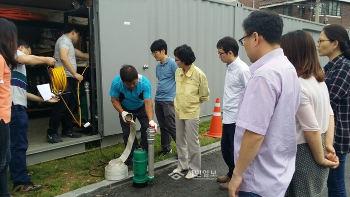 경기 광주시 경안동이 최근 전직원 20여명을 대상으로 여름철 수해에 대비하기 위해 '수해대비 모의상황 훈련'을 실시했다. 사진은 이날 훈련에 참여한 직원들이 양수기 등 복구장비 가동에 대한 교육을 받고 있는 모습.(사진제공=광주시청)