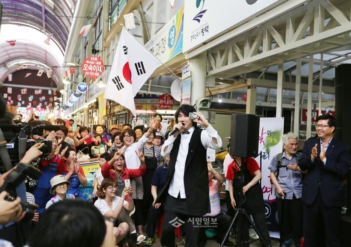 가수 김장훈씨가 최근 메르스 여파로 어려움을 겪는 전통시장 상인들과 주민들을 위해 경기 평택시 통복시장에서 '전통시장 음악회'를 개최했다. 사진은 이날 음악회에서 공연을 펼치고 있는 김씨(가운데)와 주민들의 모습.(사진제공=평택시청)