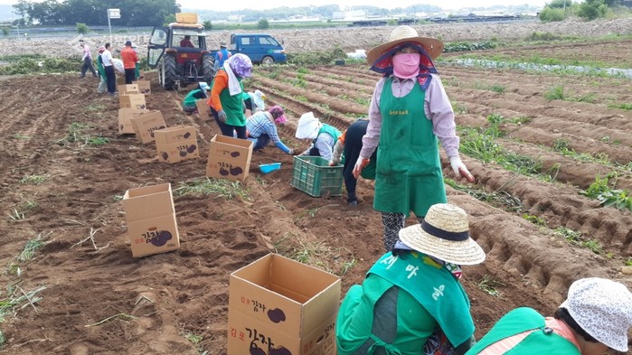 경기 김포시 통진읍 남녀새마을지도자회는 지난 29일 서암리에 위치한 공동경작지에서 '사랑의 감자캐기 행사'를 진행했다. 사진은 이날 참여자들이 어려운 이웃들에게 나눌 감자를 캐고 있는 모습.(사진제공=김포시청)