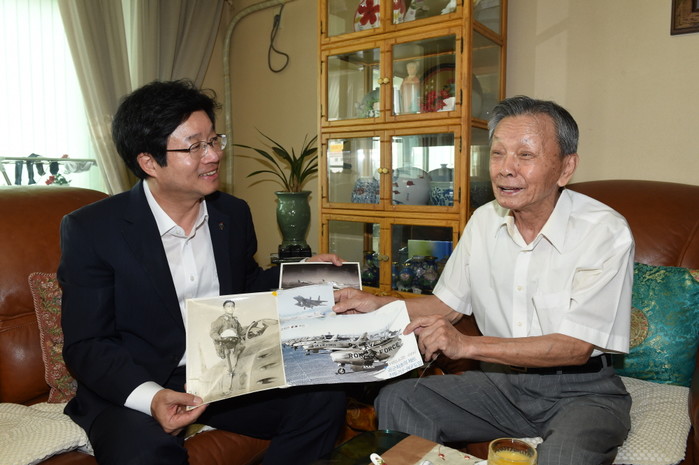 염태영 경기 수원시장은 6월 호국·보훈의 달을 맞아 지난 29일 지역내 6.25 참전 국가유공자들을 찾아 위문했다. 사진은 염 시장이 공군사관학교 기 출신 이교안 예비역 소장(84)을 찾아 이야기하고 있는 모습.(사진제공=수원시청)