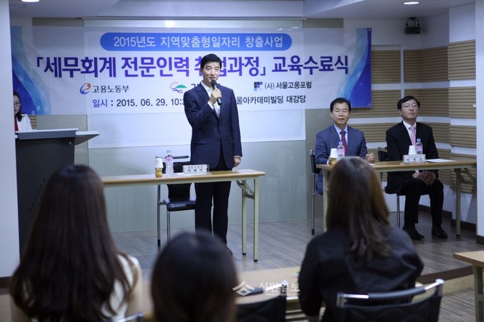 지난 29일 서울 강동구 천호 동서울아카데미 지하대강당에서 열린 '2015 지역맞춤형 일자리창출 지원사업·세무회계 전문인력 취업과정 수료식'에 참석한 이해식 강동구청장이 수료자들에게 축하의 말을 하고 있다.(사진제공=강동구청)