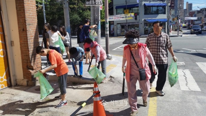 경기 고양시 일산서구 일산1동 주민자치위원회는 최근 학생 자원봉사자 15명과 주민자치위원회 20명이 참여한 가운데 마을대청소를 실시했다. 사진은 이날 청소 참여자들이 도로변 생활쓰레기와 전단지 등을 수거하고 있는 모습.(사진제공=고양시청)
