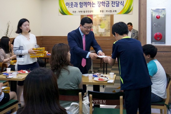 최근 서울 송파구 거여1동에 위치한 브니엘교회가 교회 지하 카페에서 지역내 저소득 중학생 10명에게 장학금 300만원을 지정 기탁하는 ‘이웃과 함께하는 장학금 전달식’을 열고 아이들에게 장학금을 전달하고 있다. (사진제공=송파구청)
