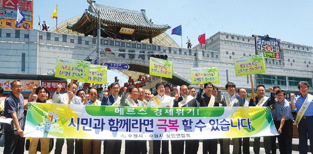 중동호흡기증후군(메르스) 여파로 지역상권이 크게 위축된 가운데 1일 오후 염태영 수원시장이 경기 수원 지동시장을 찾아 경제살리기 캠페인을 벌이던 중 상인, 시민들과 함께 ‘메르스 극복’을 외치고 있다.