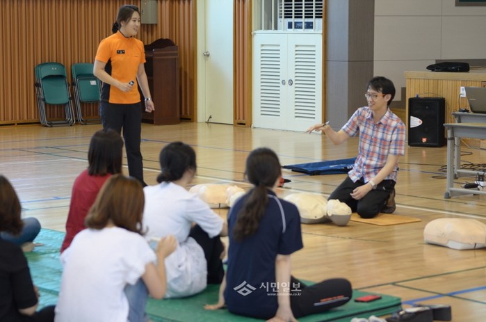 지난 1일 서울 영등포소방서가 대림동에 위치한 서울영림초등학교에서 교직원을 대상으로 '소방안전교육'을 실시한 가운데 심폐소생술 실습이 진행되고 있다. (사진제공=영등포소6방서)