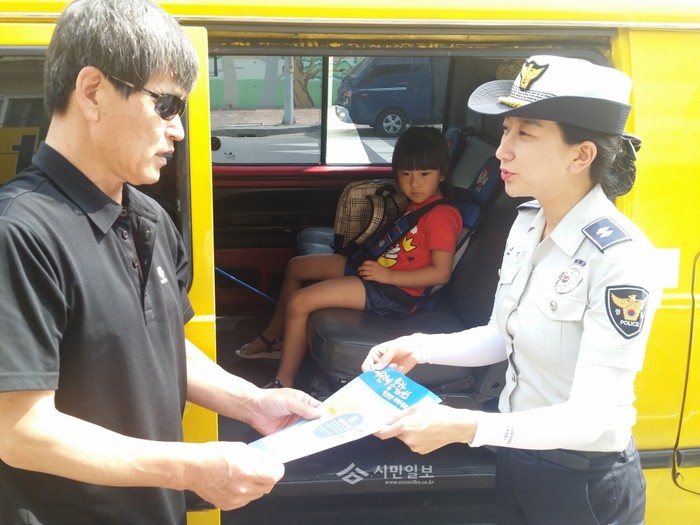 인천 중부경찰서는 최근 지역내 미술학원을 방문해 어린이통학버스 신고 의무화 등 교통사고 예방을 위한 신고의무화에 관한 홍보를 실시했다. 사진은 한 경찰관이 학원 통학버스 운전자에게 교통사고 예방 홍보물을 전달하고 있는 모습.(사진제공=중부경찰서)