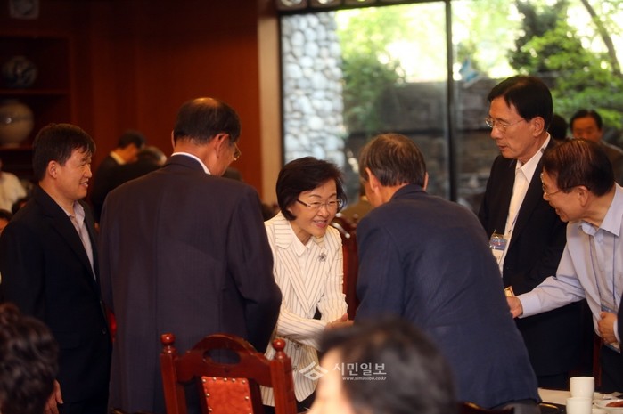 지난 1일 강남구의 한 음식점에서 열린 ‘강남구 민주평화통일 자문회의 오찬’에 참석한 신연희 강남구청장(가운데)이 회원들과 인사를 나누고 있다.(사진제공=강남구청)