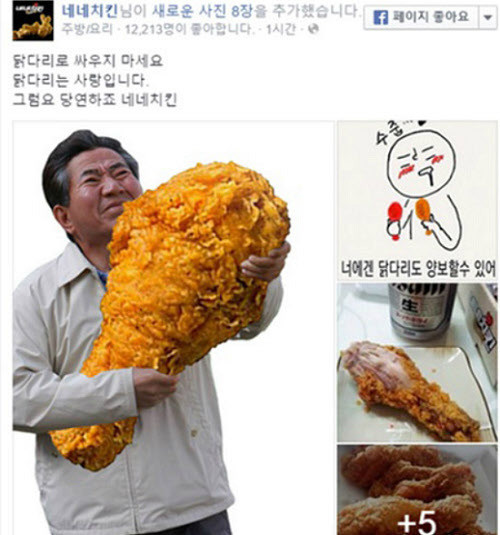 앞서 지난 1일 오후 네네치킨 경기서부지사 SNS에는 "닭다리로 싸우지 마세요. 닭다리는 사랑입니다. 그럼요 당연하죠 네네치킨"이라는 글과 함께 고 노무현 대통령이 닭다리를 껴안고 있는 합성사진이 올라왔다가 삭제됐다. 이 사진은 네네치킨 본사 페이스북에도 노출됐다.