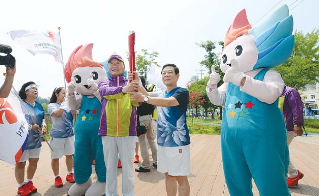 '2015 광주 하계유니버시아드' 개막이 하루 앞으로 다가온 2일 오전 광주 서구 운천저수지에서 박광태 명예위원장이 조직위원장인 윤장현 광주시장에게 성화를 전달하고 있다.