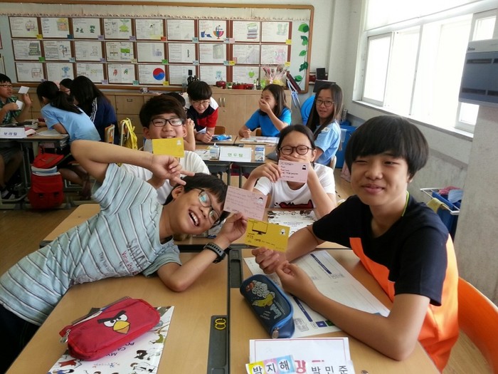 경북 구미시 선주초등학교가 최근 6학년 학생들을 대상으로 진로 코칭 캠프를 운영했다. 사진은 캠프에 참여한 학생들이 자신의 감정을 표현한 카드를 만들고 기념촬영한 모습.(사진제공=구미교육지원청)