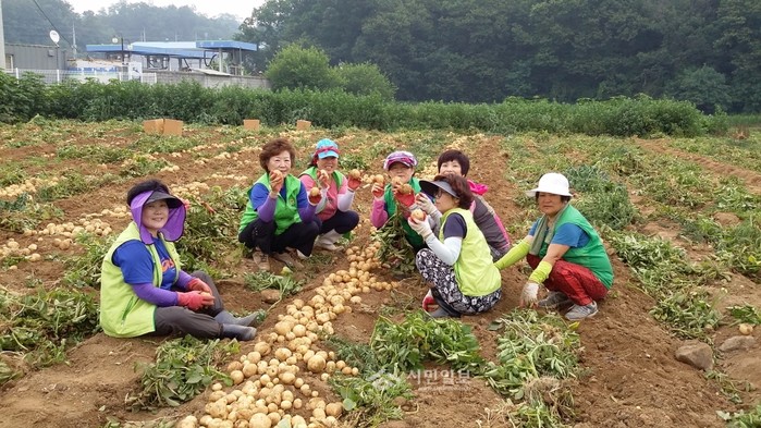 최근 경기 동두천시 상패동 새마을남녀지도자협의회원, 상패동 주민센터 직원 등 30여명이 ‘이웃돕기 재원마련을 위한 사랑의 감자수확’을 실시했다. 사진은 수확한 감자를 들고 있는 새마을남녀지도자협의회원과 주민센터 직원의 모습.(사진제공=동두천시청)