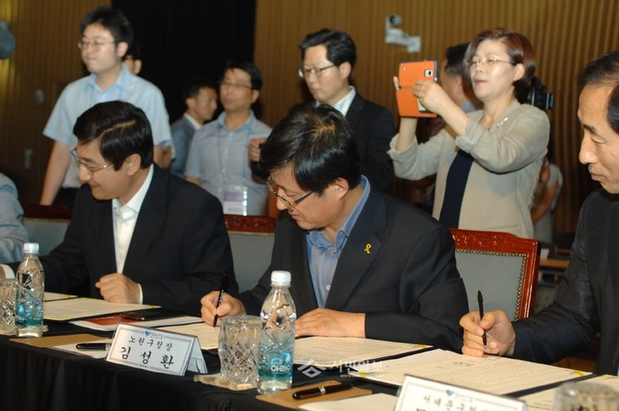 김성환 노원구청장이 최근 서울시 본청 간담회장에서 '사회적 가치에 기반한 공공조달 등에 관한 양해각서(MOU) 체결식'에 참석했다. 사진은 체결식에 참석한 김 구청장(가운데)이 협약서에 서명하고 있는 모습.(사진제공=노원구청)