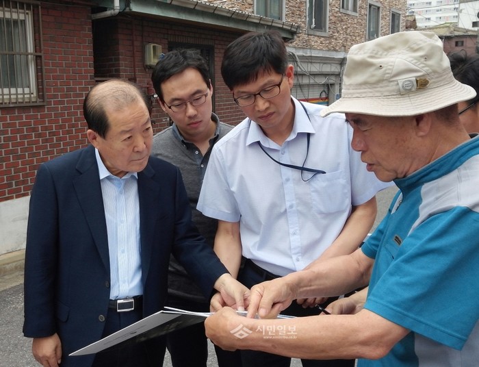 박홍섭 마포구청장(왼쪽)이 최근 주민이주가 진행 중인 '대흥제2구역 주택재개발정비사업'과 관련해 사업에 참여하지 않는 주민들의 불편사항을 개선하기 위해 현장을 찾아 주민들의 애로사항을 듣고 있다. (사진제공=마포구청)