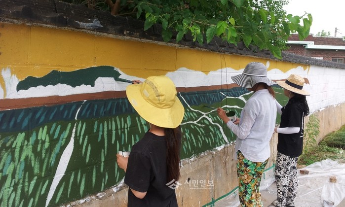 경기 용인시 농업기술센터가 최근 장수마을 사업의 일환으로 백암면 장평리 장재마을의 담장에 벽화 제작을 지원했다. 사진은 마을 담벼락에 벽화를 그리고 있는 참여자들의 모습.(사진제공=용인시청)